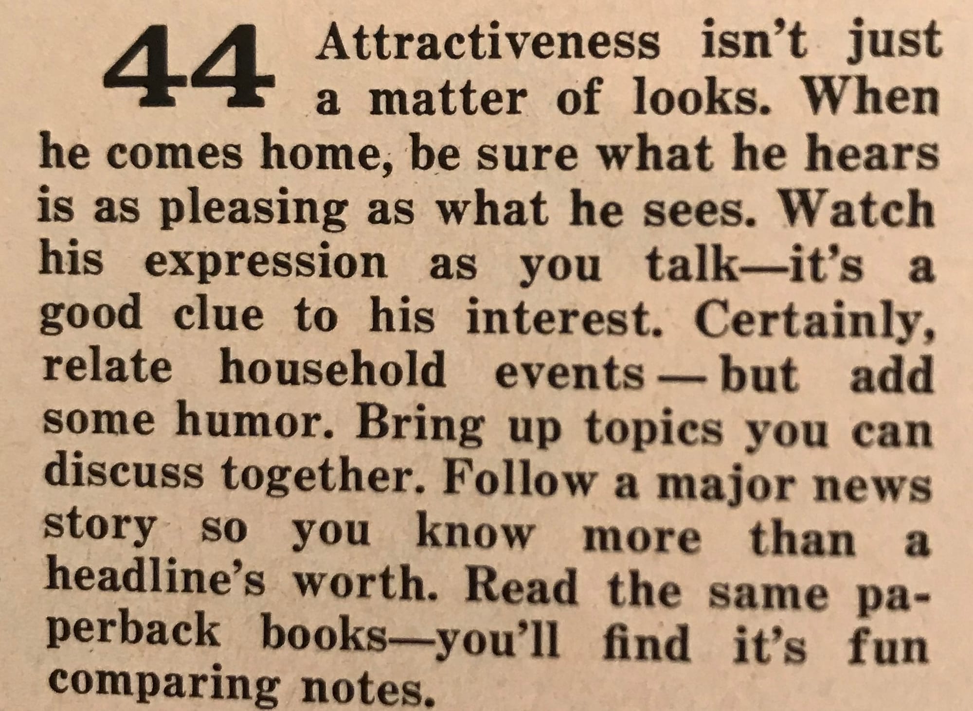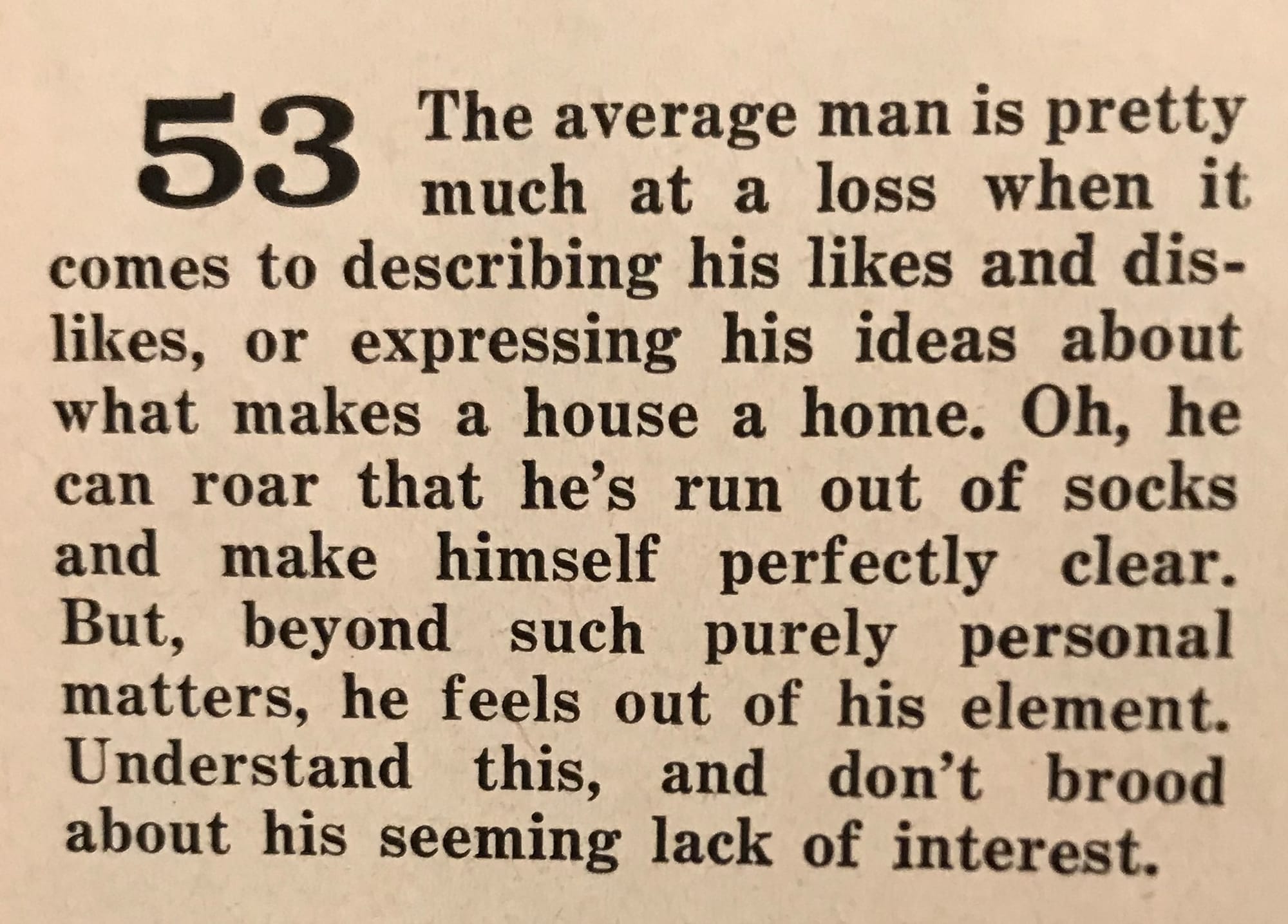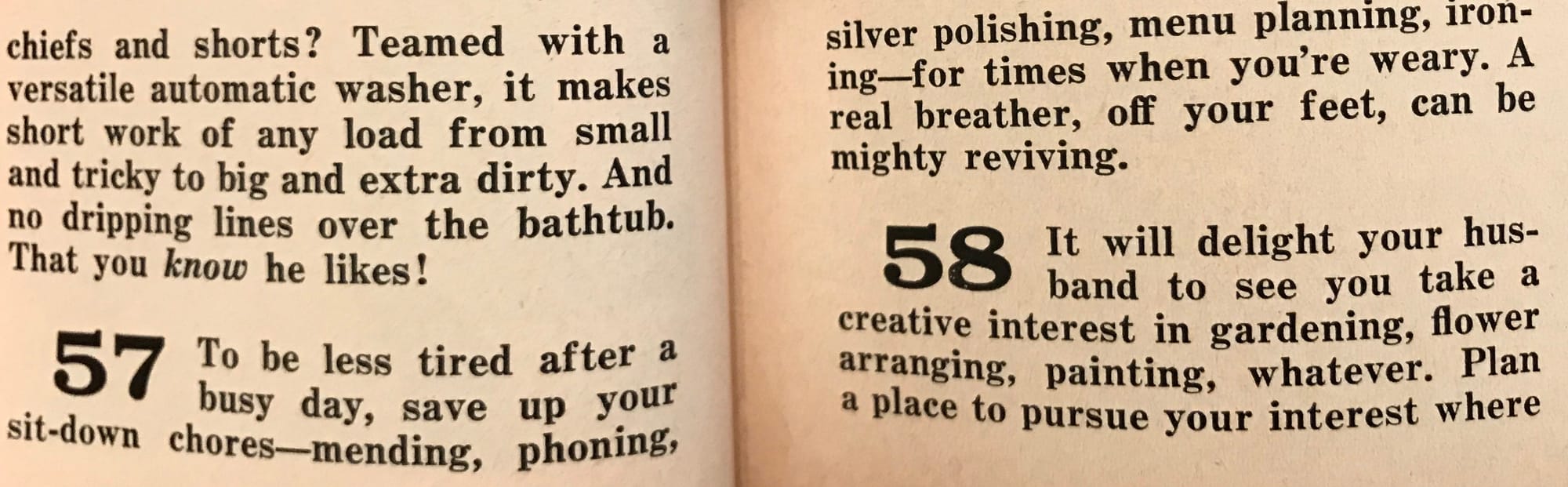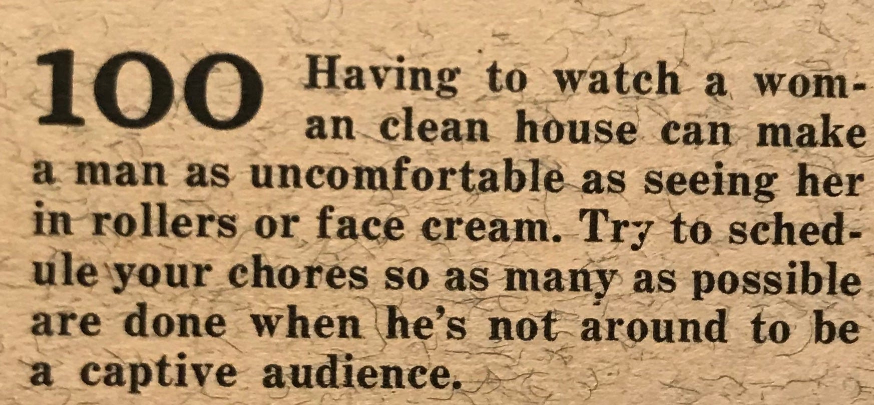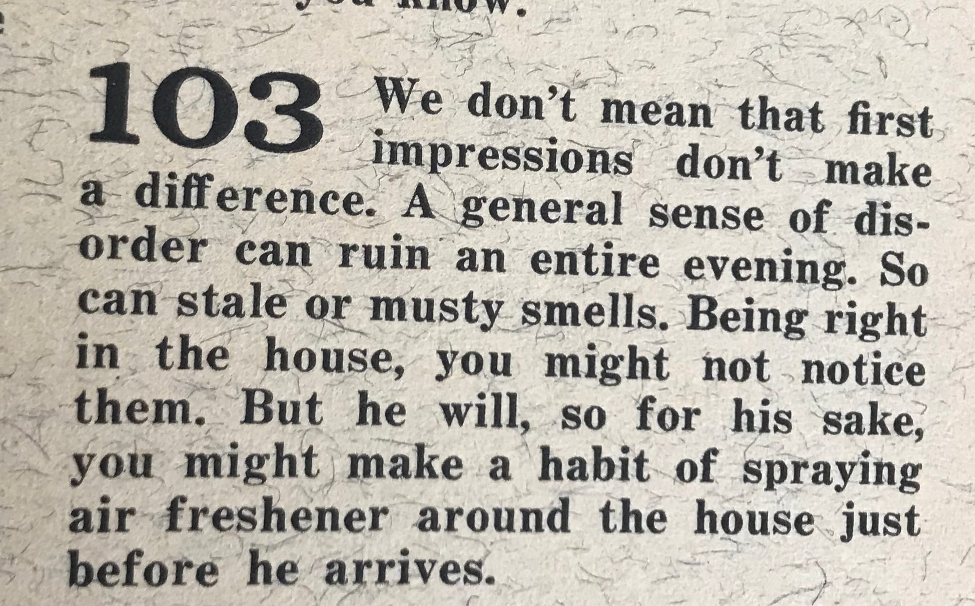 I am super curious to learn some day how this type of advice got written and published in 1965, but I have one clue:
