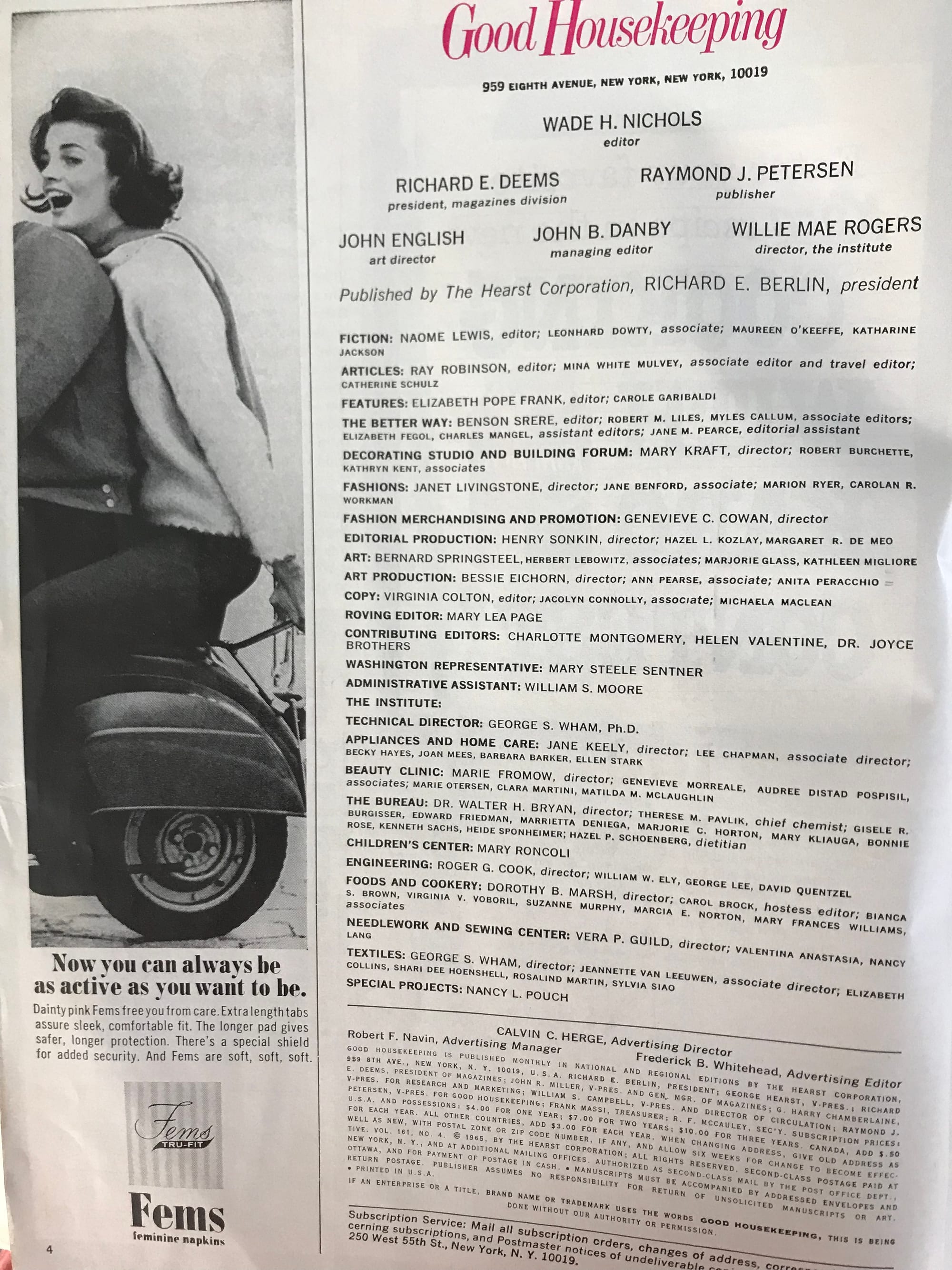 The only woman on the masthead, Willie Mae Rogers, was hired by Richard Nixon as a “consumer consultant” and lost her job due to a conflict of interest. Hmm.