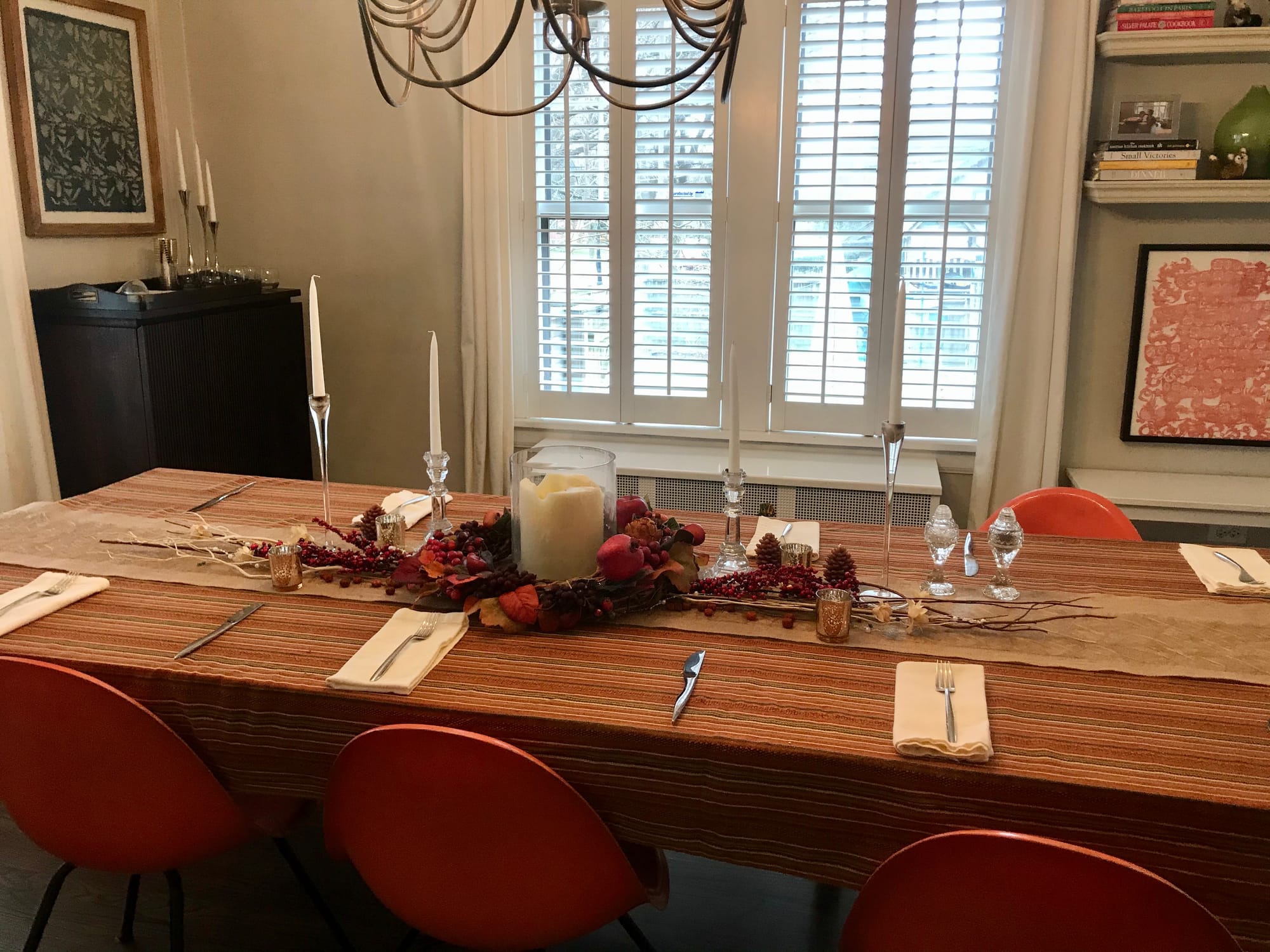 My mother serves individual servings of butter to guests in tiny ramekins and has tiny heavy silver bud vases that she picked up at an antiques fair in England. The funny thing is that she never made it look fun—the stress it took to throw a beautiful holiday or book club meeting or cocktail party was never hidden. But I also got tricked by getting married, and the process of setting up a registry. It makes you think that hosting beautifully and creatively is a fun and relaxing thing to take pride in. Some people are like this! I have friends who sincerely are really good at this stuff and like it and I like them despite that. But it is too much for me. My favorite thing to cook when friends come over is cocktails and LaCroix and ordered-in pizza and salad and storebought cookies. We have fun. Nobody ever seems to mind if I serve the Oreos right from the package instead of on a seasonal Nora Fleming tray with a charming porcelain leaf or some shit on it. Anyway this year I put my husband in charge of table decorations at Thanksgiving, and had no doubts he’d do a good job. After all he made this film so I know he’s good at tiny little fussy things looking just right. I showed him what decorations we already had and then he took himself to Michael’s. And he nailed it!