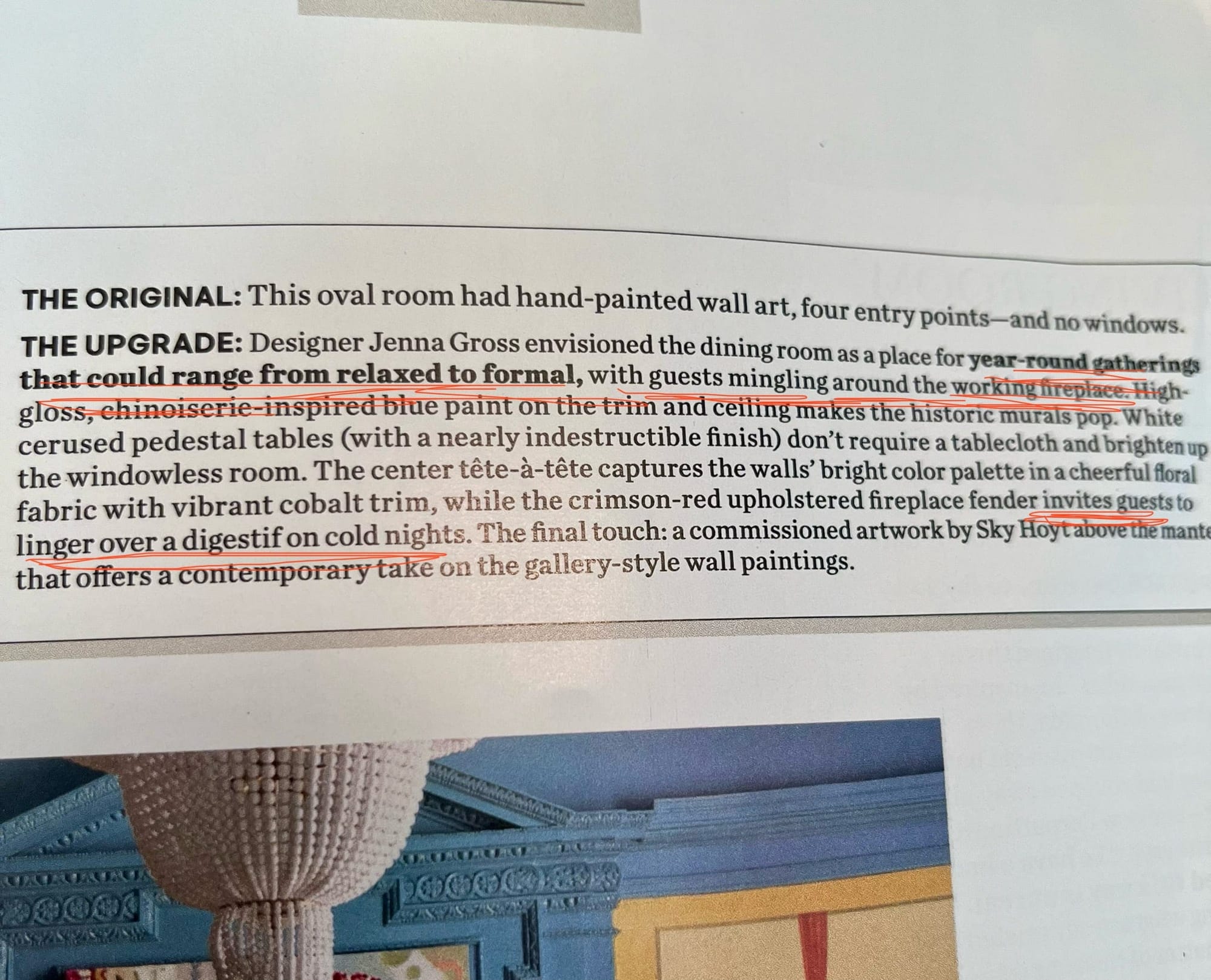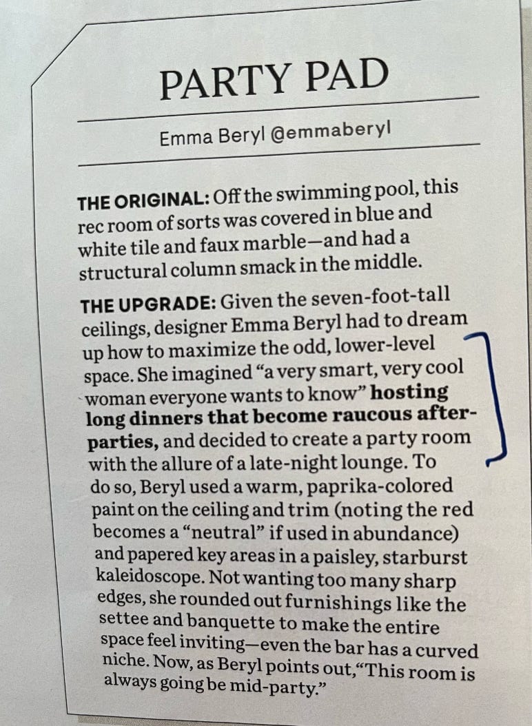 My mom gives me her finished copies of House Beautiful, which often makes me angry, not inspired/awed. I feel like each article should come with a disclaimer saying how much the home, property tax, designer’s services, materials, and upkeep cost, along with how long the contractors took and how/where the owners lived while the place was being reno’ed so we be real with what people are paying for.