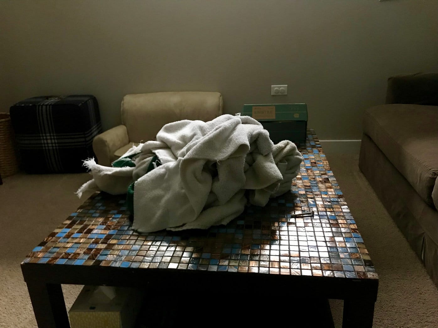 - Extra linens and towels (the thicker the better) old sheets (fitted ones are especially great for over couches). Put them everywhere barfing may occur.