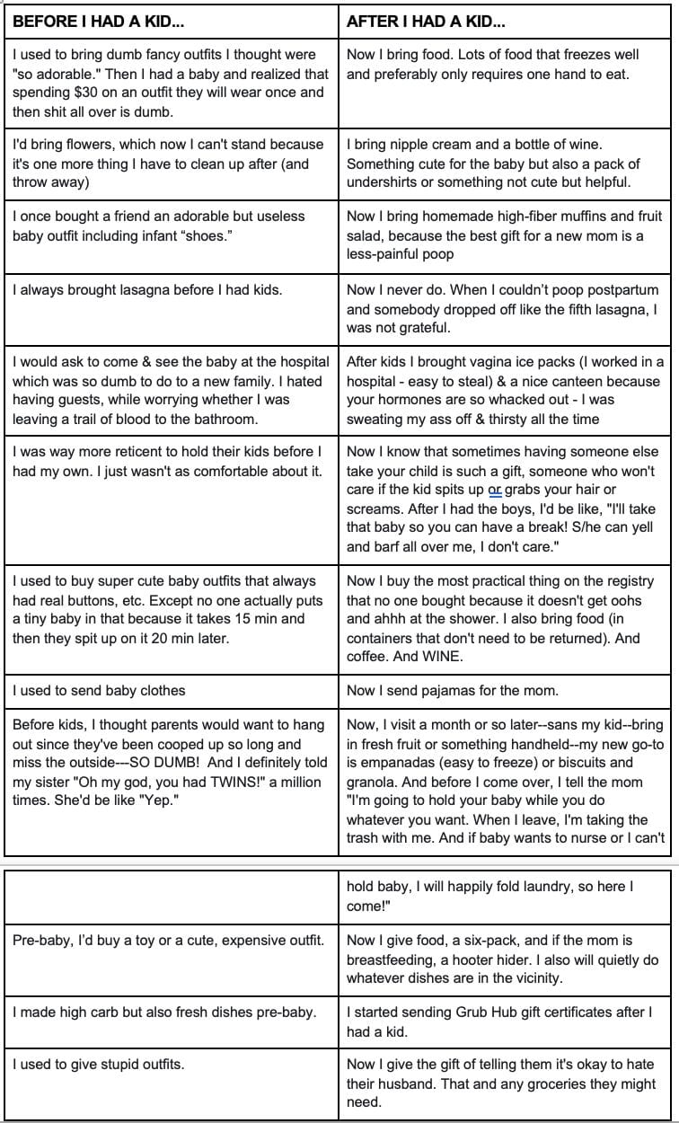 I asked some of my friends how what they bring new moms has changed since becoming moms themselves: