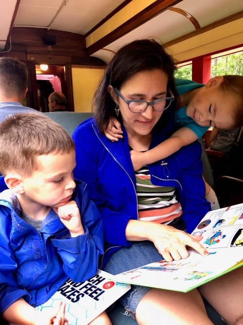 In comparison to the past, it went so much more smoothly than trips where our younger son in particular had some rocky adjustments to time zones, nap times, sitting still at restaurants and on a plane, etc., about when he was the age of that little girl in the airport. I have a photo of him crying in the backseat during one vacation that I am not posting here because I'm a really good person and respect his/my dignity but here's another photo (I may have shared before) where he was not remotely welcome to hang on me this way (on an old timey train in New Hampshire for some reason) and I was on the verge of losing my shit.