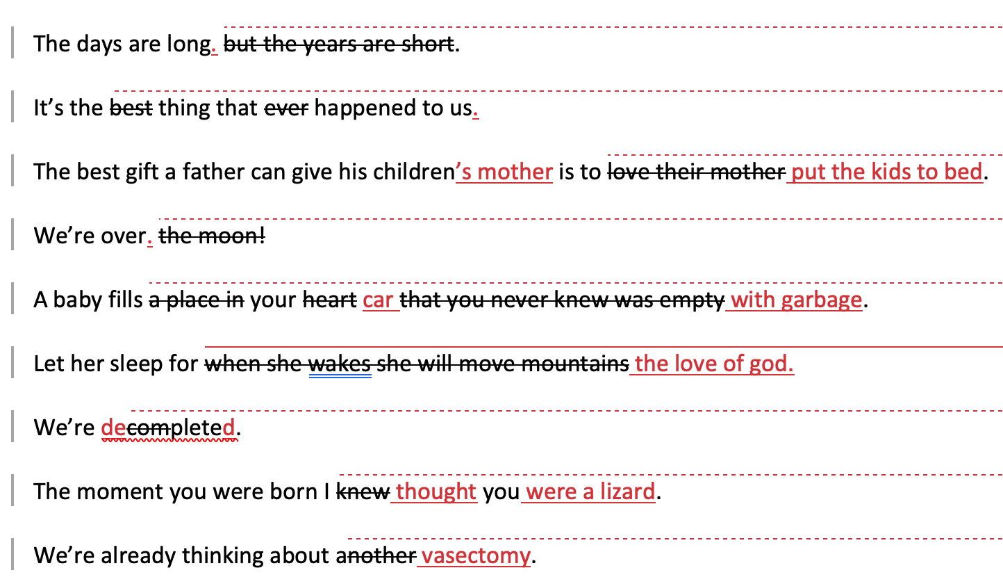 One aspect of my day job is copyediting and in honor of Mother’s Day, I took a stab at correcting some old chestnuts about new parenthood: