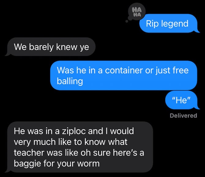 Me texting with a witchy friend on how she came to find a deceased worm named Legend in her 2nd grade daughter’s backpack: