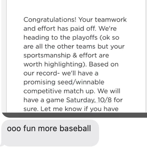 Then maybe a few years later your kid seems to click with a physical/competitive activity. You’re glad they found a thing where all at once they can listen to someone and move around and be with friends and remember rules and experience some light character-building struggles and triumphs and have a place outside the house to go. Also, maybe for a few years, depending on where you lived, your kids couldn’t do these type of activities due to COVID. So what are you going to do, not take your kid to games and practices and stuff? But then all of a sudden that’s the majority of your week. At least that’s my experience.