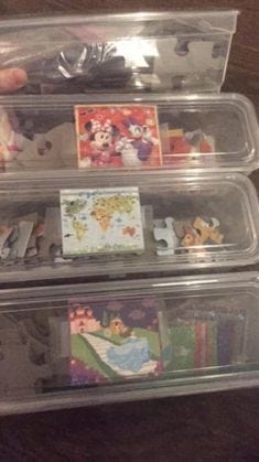 “I am stupid-proud of our puzzle storage system, since every original box is torn open with gusto whenever we puzzle. They are a bunch of clear acrylic interlocking boxes with handle-locks. We put the puzzle pieces in each and tape the picture to the top. Now they stack very nicely and are easy for little hands to pull out/put away, as well as travels well. We got different sizes for various puzzles and all the Melissa and Doug stuff that inexplicably don’t come lids or containers for the 17-piece toys. We also use them for the various figurines. Basically, any toy that can be reboxed into these things makes my house and mental space clearer.”