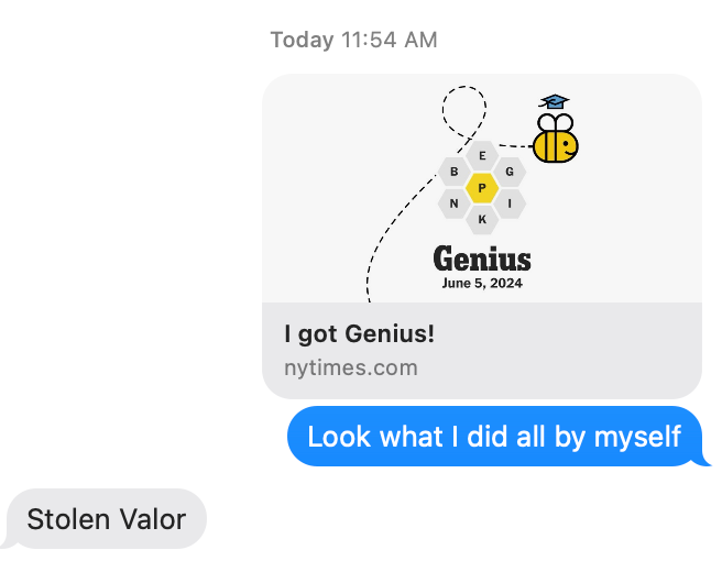 My husband after I showed him how I got our shared Spelling Bee over the hump to Genius by contributing just one word at the very end: