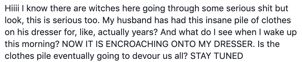 For several years I just washed my husband’s clothes along with the other three people’s in the house because it seemed easier than observing his laundry piles wax and wane like the tide. He will let it sit for days. I don’t count but I’d say four days to a week. I put laundry away immediately, usually listening to a podcast or music in my earbuds.