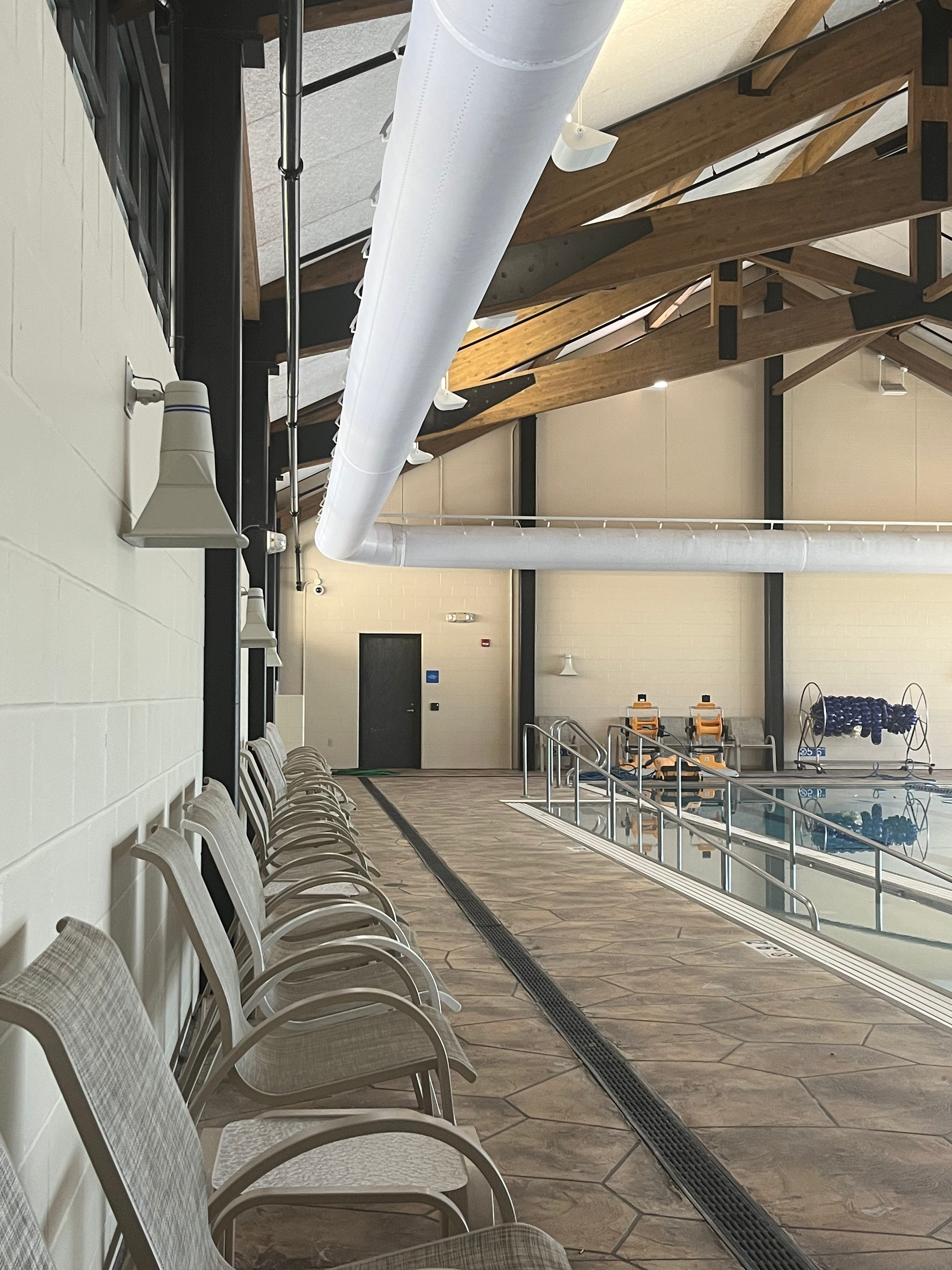 A line of empty chairs next to me a few months ago, when my son asked me to hold his snack for him while he went swimming: