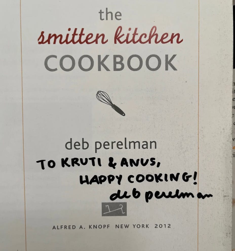 And finally, Deb doesn’t take herself too seriously, as evinced by her allowing me to publish this inscription on her first cookbook that I got for free because it had a hilarious misspelling in it: