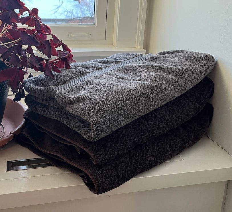 - Our towels. All right, a few of our towels do look their 15 years, with bleach stains and frayed edges, but the towels our kids use end up on the floor so often I don’t mind retaining some that are unpretty-but-functional. But a lot of them are still in great shape, and they somehow escape getting towely mildew smell. These were a brand called Bloomingdale’s “Collection Fifty Nine” but I think it’s called Hudson Park now. We got them in dark brown and gray, perhaps grim colors, but they aged well! I remember my friend Lisa jokingly telling me that she could never buy me something in a color called “Fudge cake” but I stand by my choice.