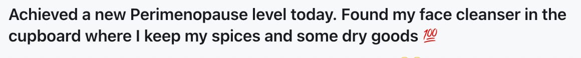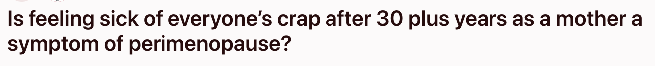 I peruse the perimenopause sub on Reddit, and sometimes the conversation topics make me laugh in their heartfelt angst and how they cover such an insane range of symptoms. But there is a type of gallows humor, a type of furious disbelief, that makes me feel like while peri is a hard age to endure on your own, when we assemble, we’re kind of funny. I think if you’ve ever wondered whether you can be funny and perimenopausal the answer is… … …. what was the question?