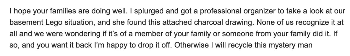 Later that night, I asked my husband and the boys if they recognized the drawing. “Oh, yeah, sometimes I put stuff on that piece of paper,” my younger one said, which is almost worse. The ghost is the child’s secret playmate. Great. But nobody otherwise recognized who the drawing was of or could think of who had done it. I have some semi-spicy charcoal sketches I did many years ago at a nude portrait drawing party, but those are rolled up and stored in my bedroom, and I haven’t tried my hand at sketching since then.